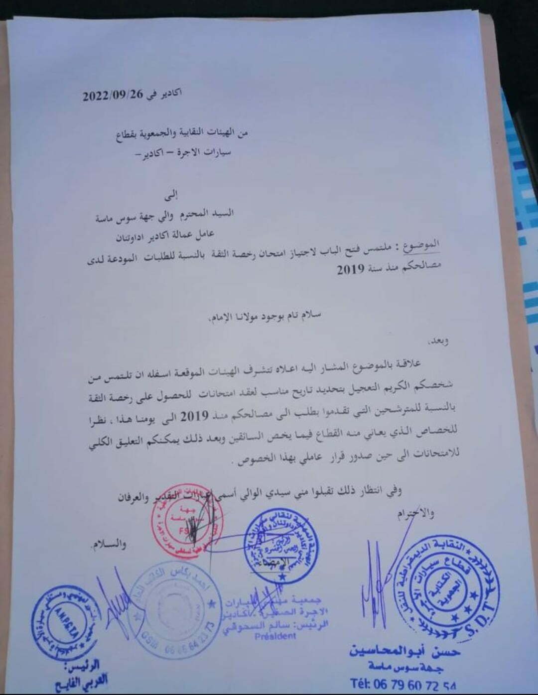 هيئات نقابية وجمعوية تطالب والي جهة سوس ماسة بتنظيم امتحان الحصول على رخصة التقة نظار للخاص الدي يعرفه القطاع…